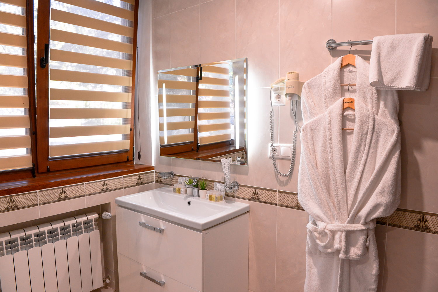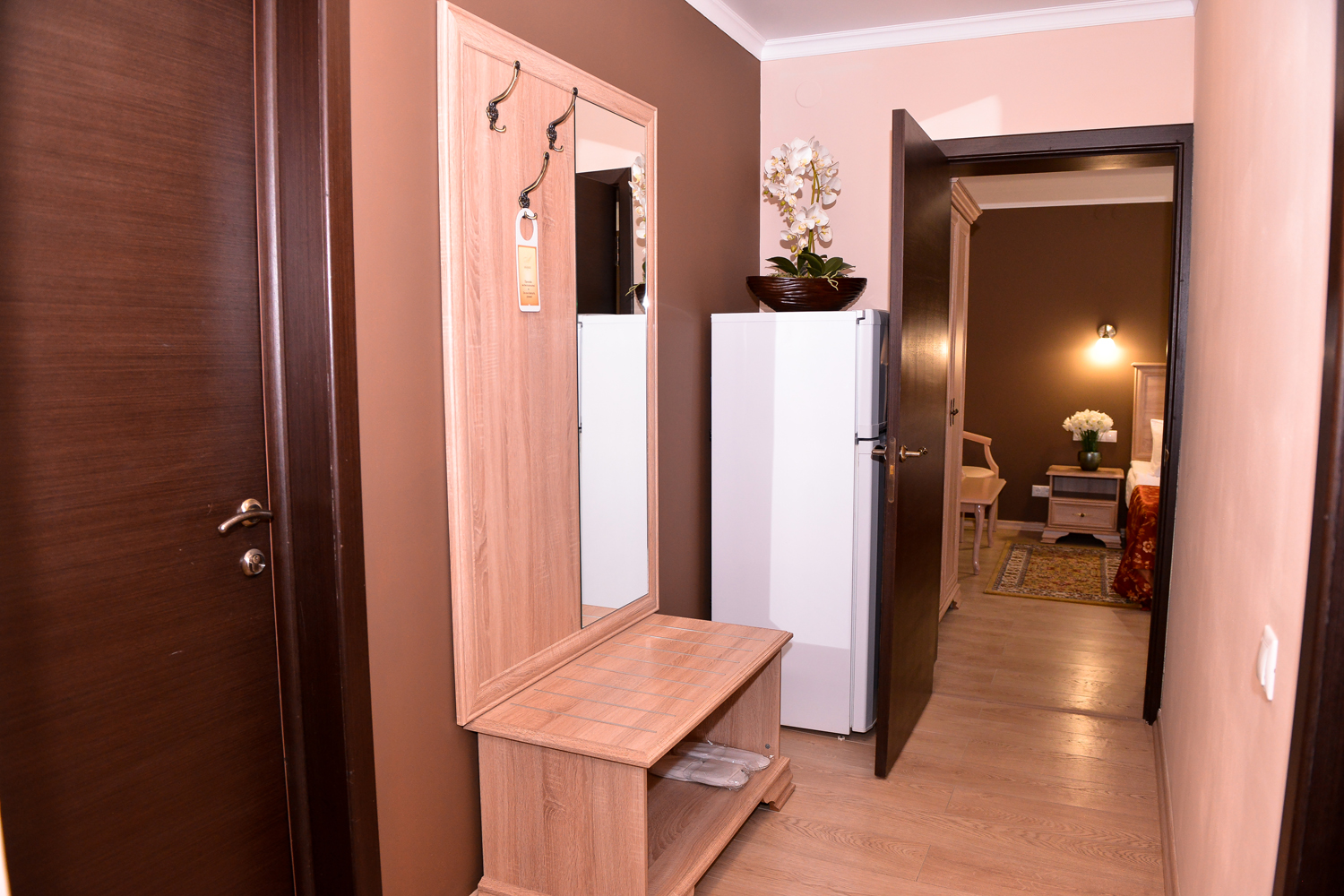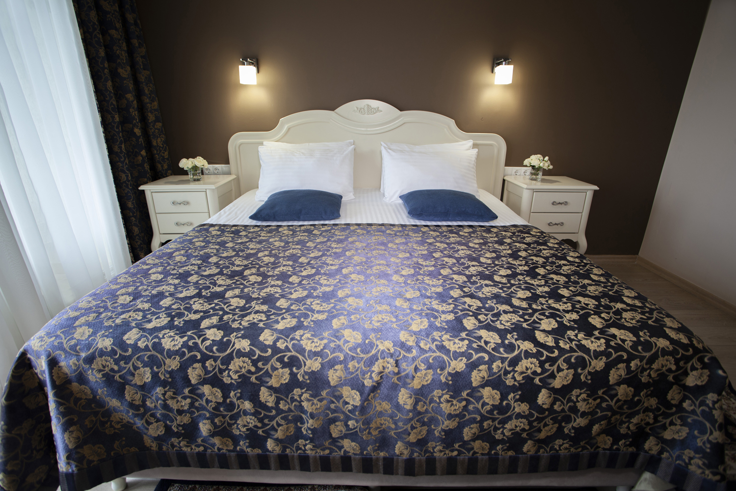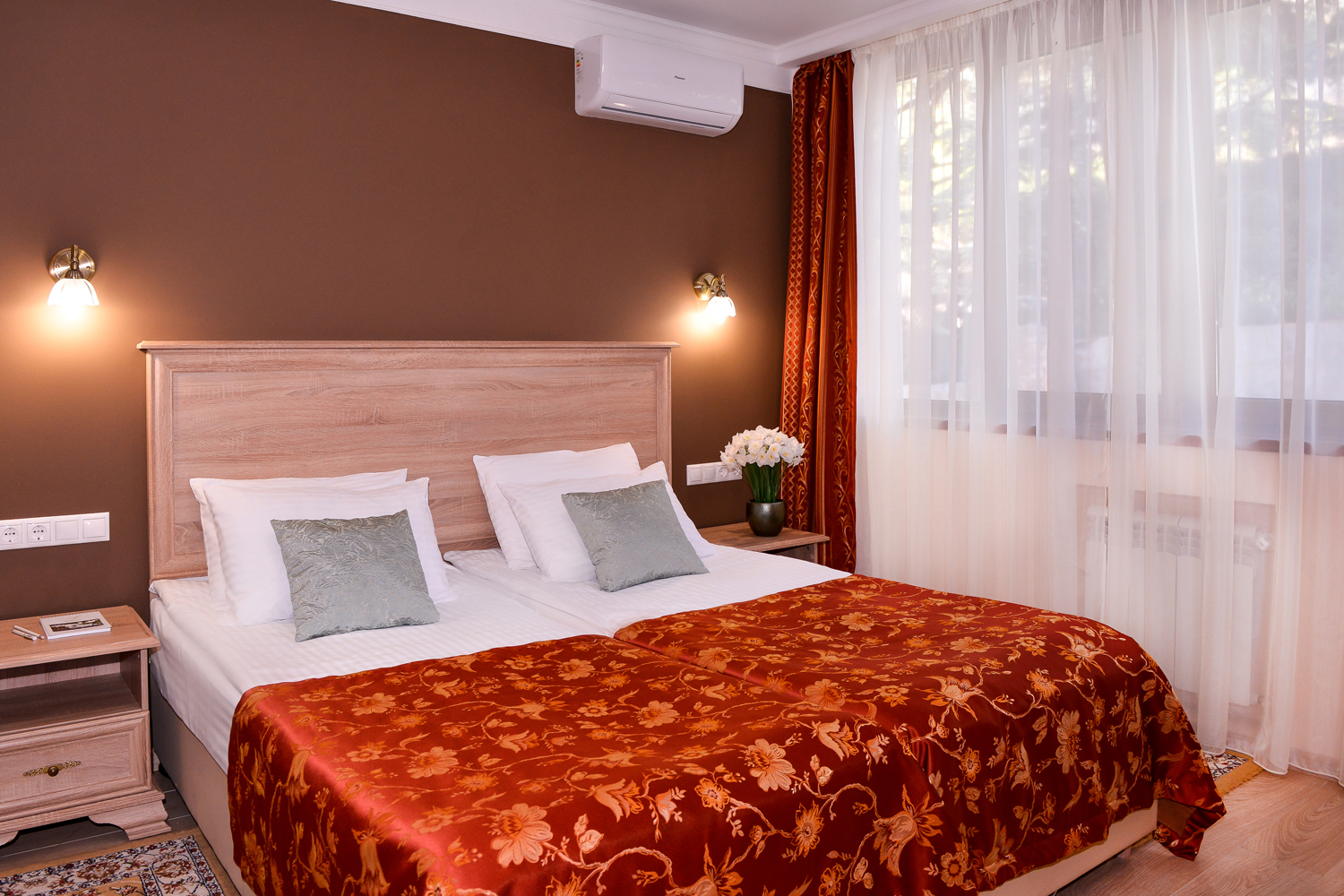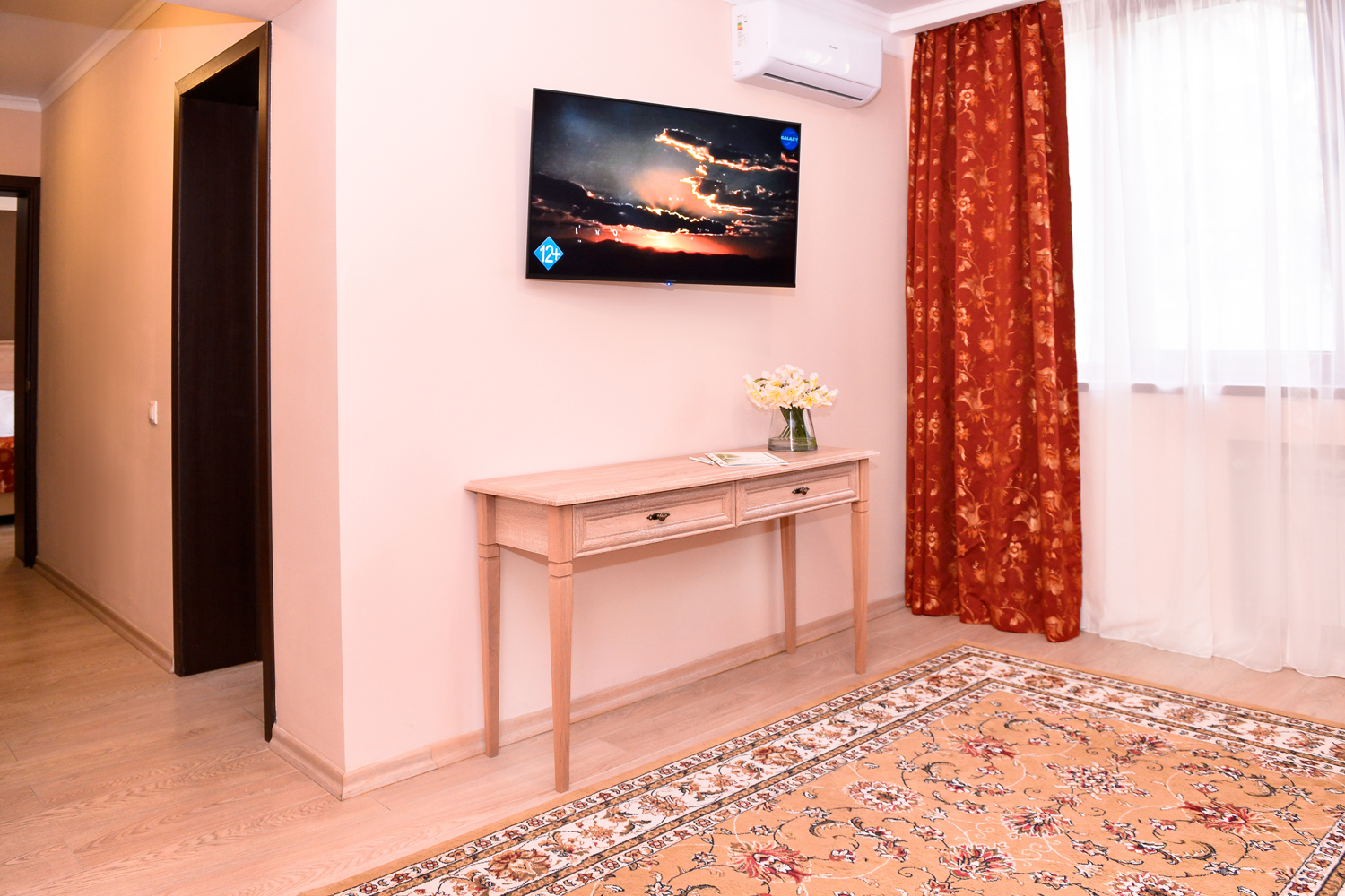 Площадь номера - 40 кв.м. 2 осн. места. 1 доп. место. Мебель: вешалка, диван, зеркало, кровать двуспальная, прикроватные тумбочки, стол, столик журнальный, стулья, тумба, шкаф. Оборудование: кондиционер, мини-холодильник, телевизор ЖК. Санузел: с душем, тапочки, туалетные принадлежности, фен, халат. Сервис: Wi-Fi бесплатно, смена полотенец, смена постельного белья, уборка номера.