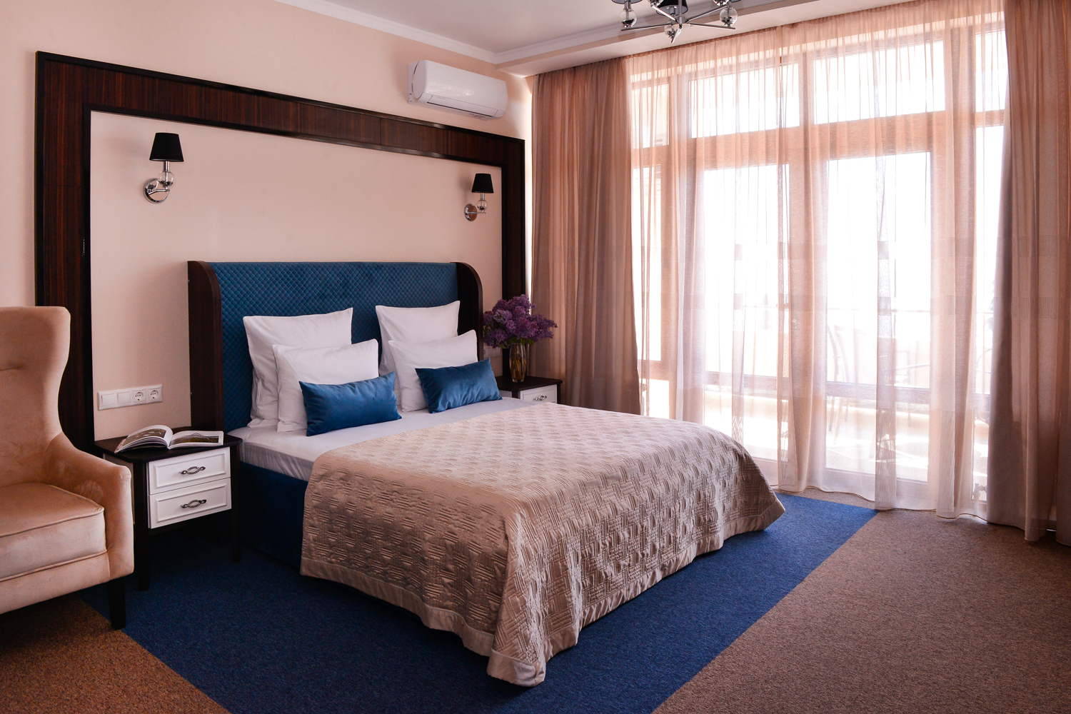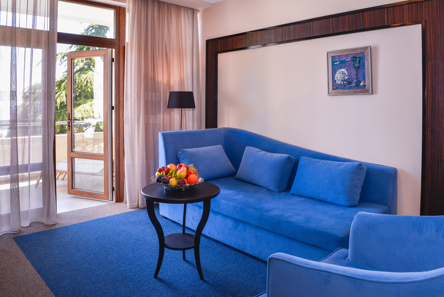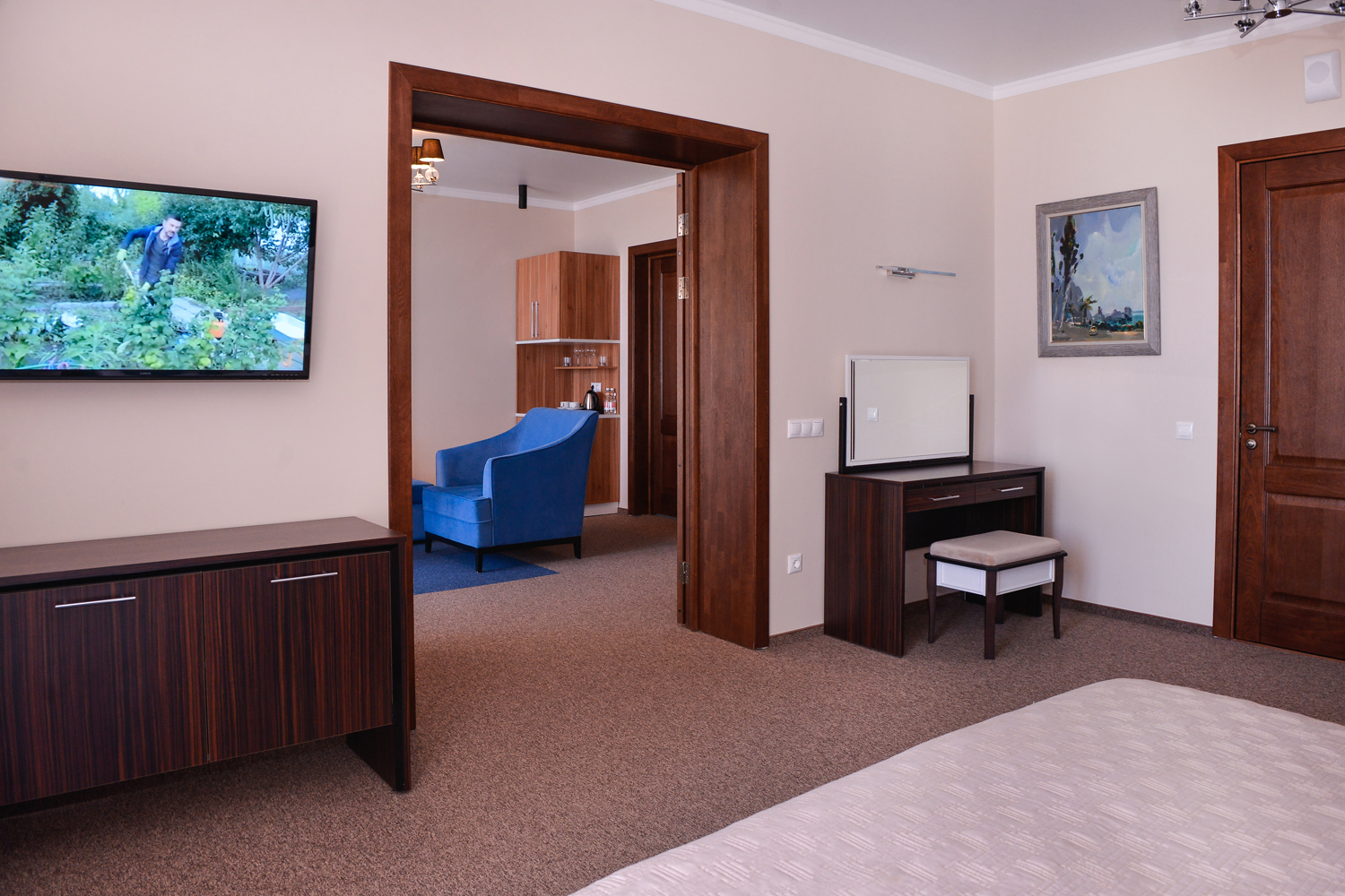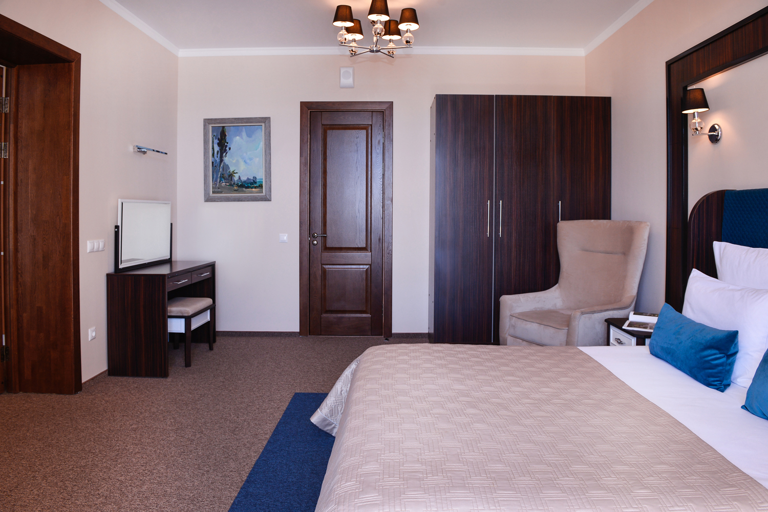 Площадь номера - 57 кв.м. 2 осн. места. 2 доп. места. Балкон. Мебель: диван, зеркало, кресло, кровать двуспальная, набор мягкой мебели, прикроватные тумбочки, столик журнальный, столик туалетный, стул, шкаф. Оборудование: кондиционер, набор посуды, телевизор, холодильник, электрочайник. Санузел: биде, с ванной, тапочки, туалетные принадлежности, фен, халат. Сервис: Wi-Fi бесплатно, смена полотенец (ежедневно), смена постельного белья (1 раз в 3 дня), уборка номера (ежедневно).
