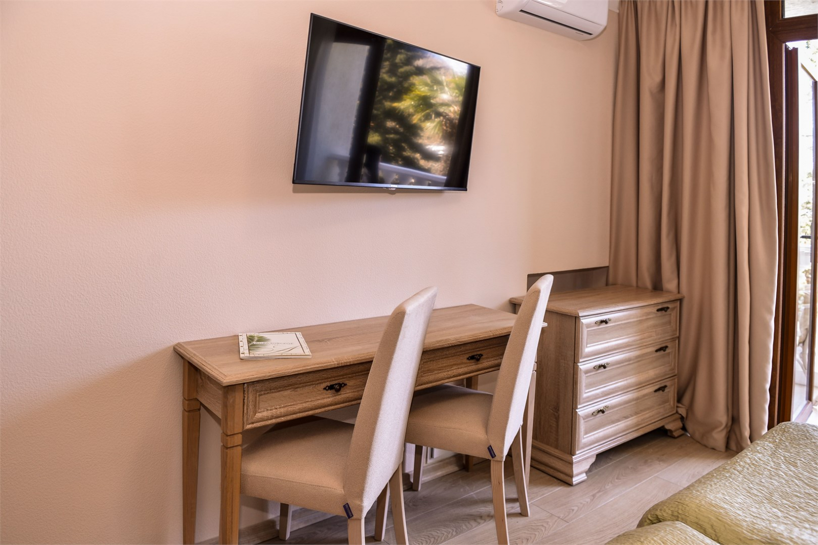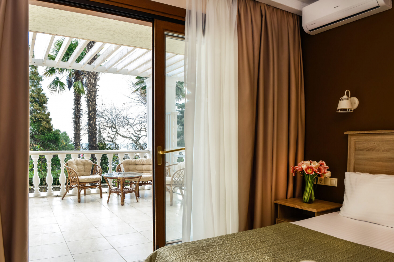 Площадь номера - 20 кв.м. 2 осн. места. 1 доп. место. Мебель: зеркало, кровати односпальные, прикроватные тумбочки, стол, стул, шкаф. Оборудование: кондиционер, телевизор, холодильник. Санузел: с душем, туалетные принадлежности, фен. Сервис: Wi-Fi бесплатно, смена полотенец (1 раз в 3 дня), смена постельного белья (1 раз в 3 дня), уборка номера (ежедневно). Терраса.